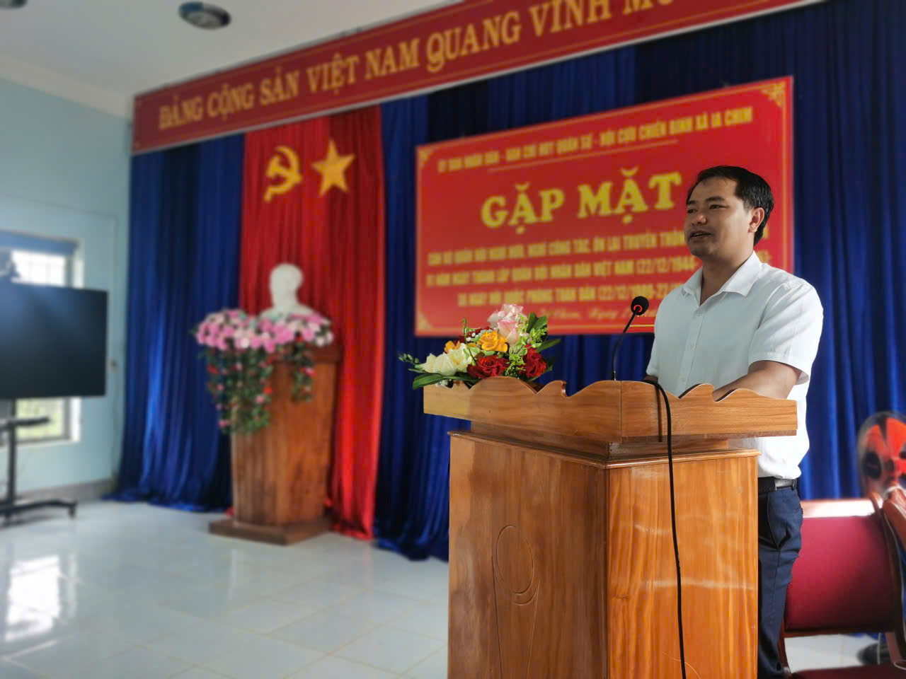 Đồng chí A Đam, UVBTV, phó Chủ tịch HĐND xã tặng hoa và quà cho cán bộ Quân đội nghỉ hưu, nghỉ công tác và hội viên Hội Cựu chiến binh